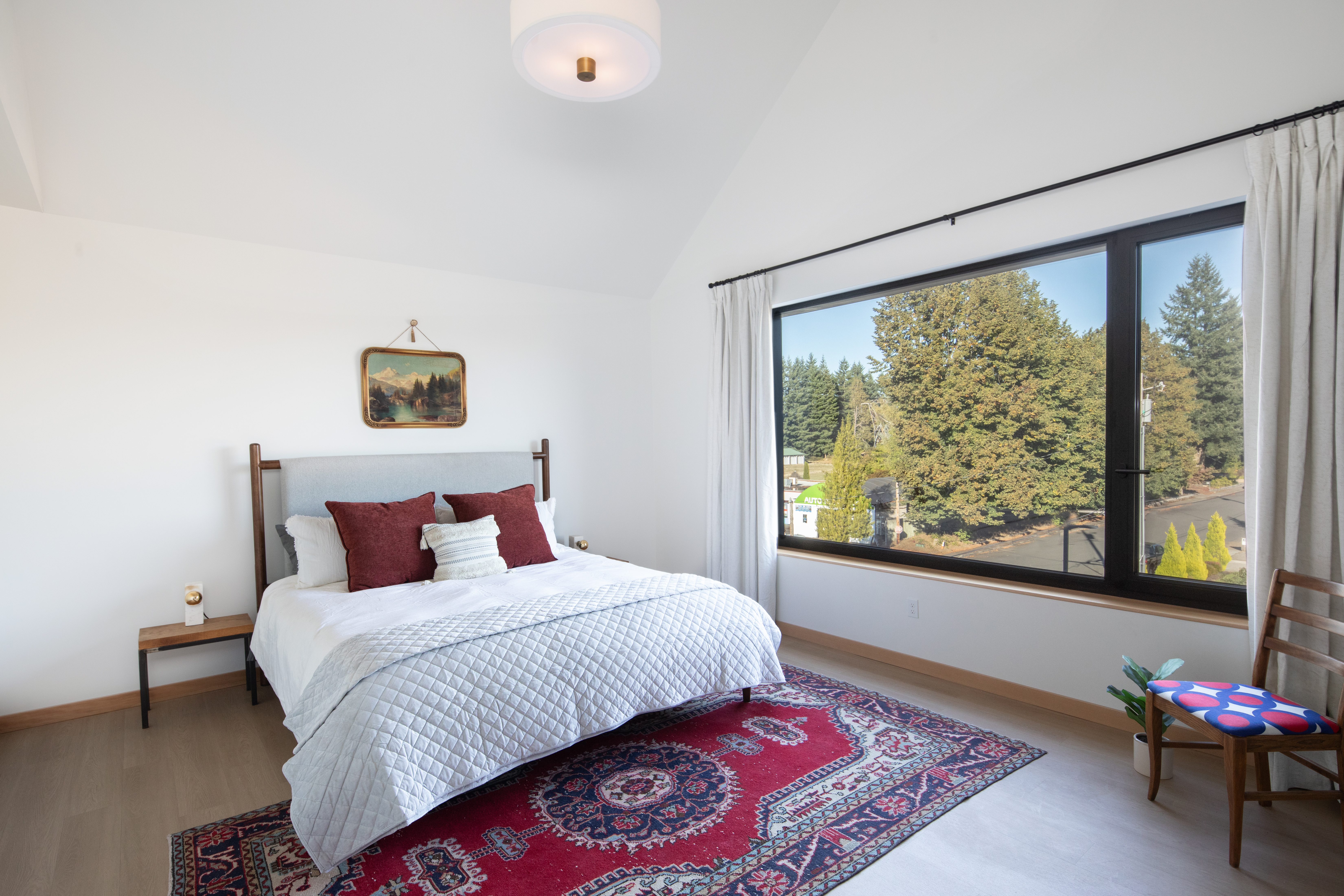 Open-concept living space and a spacious bedroom.